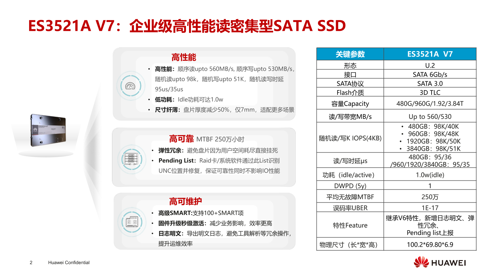 性能方面,華為 SATA SSD ES3521A V7 采用 U.2 形態,讀寫速度最高分別為 560/530MB/s,讀寫時延分別為 105/40μs,尺寸厚度不到上一代的一半。